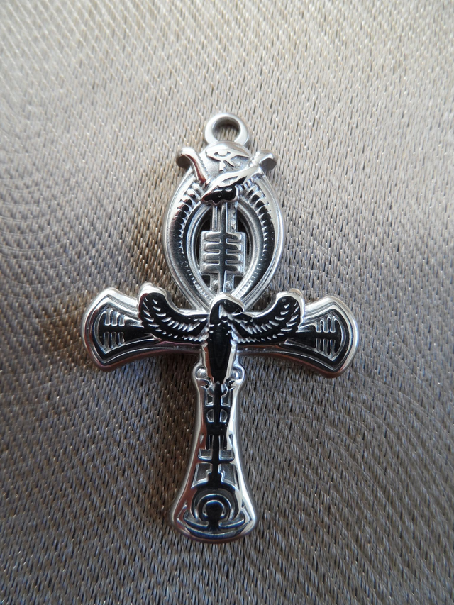 La croix ankh, symbole égyptien de la vie éternelle, de l’immortalité et de la régénération, est enrichie par l'œil d'Horus en haut, symbole de protection, de clairvoyance et de sagesse divine.