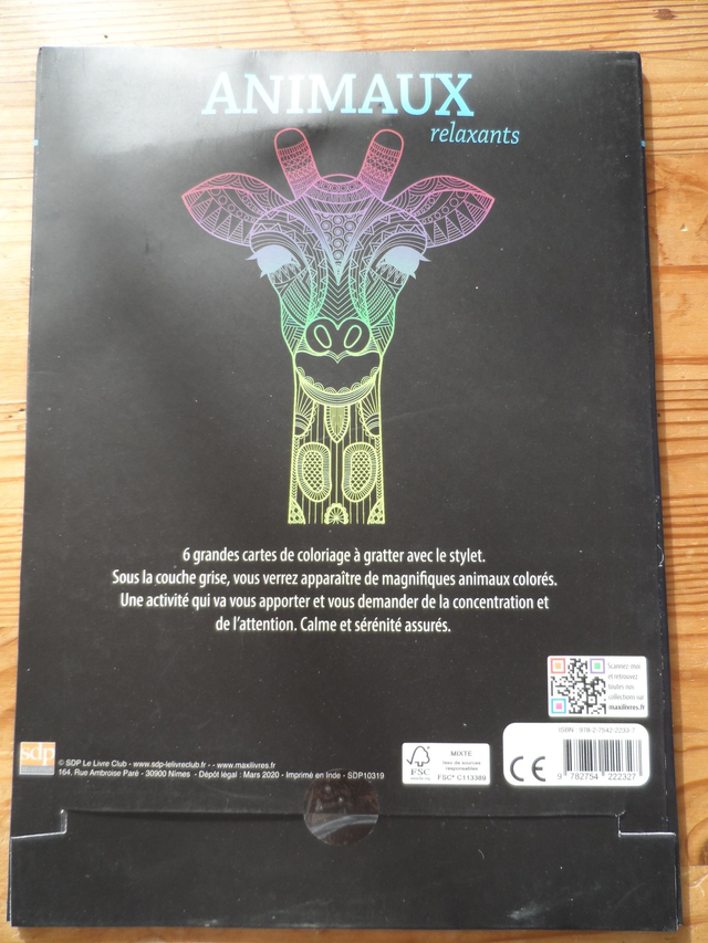 6 grandes cartes de coloriages à gratter avec le stylet. Sous la couche grise, vous verrez apparaître de magnifiques animaux colorés. Une activités qui va vous apporter et vous demander de la concentration et de l'attention. Calme et sérénité assurés.